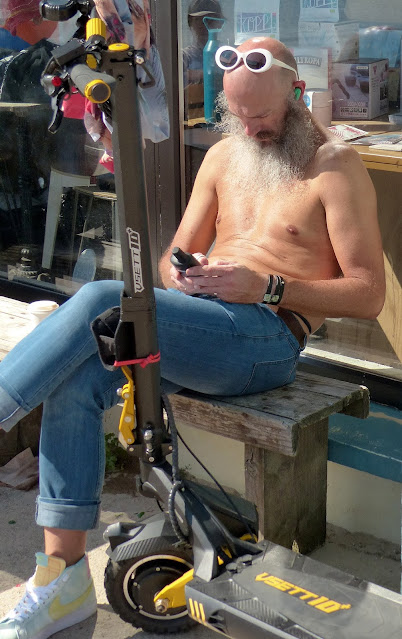 2. Great pictures! I thought the guy was looking at a bottle of sunscreen. Old fashioned phone! Love the dog ont he paddle board.
